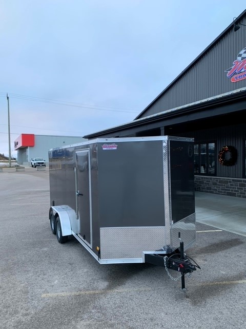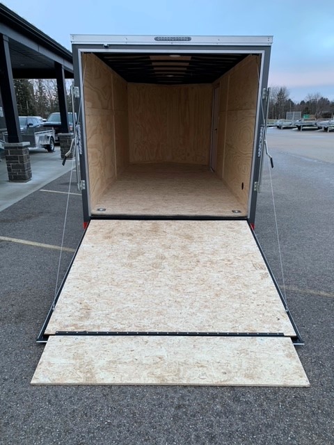 Other Features: 2″ X 6″ MAIN FRAME, 18″ V-NOSE, COBRALINED TONGUE/REAR BUMPER, 16″ O.C. FLOOR AND WALLS, 24″ STONEGUARD, SIDE DOOR RV LATCH & BAR LOCK, 1 PC ALUM. ROOF, 4 D-RINGS IN CORNERS, 3/8″ PLYWOOD WALLS, REAR STABLIZERS (PAIR), SEMI-SCREWLESS EXTERIOR (SCREWS ON SEAMS ONLY), SIDE VENTS X2, 7-WAY PLUG HOLDER
